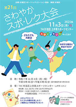 問い合わせ | (公財)杉並区スポーツ振興財団内 杉並区スポーツレクリエーション協会 事務局 TEL:03−5305−6161(平日 8:30-17:15) |